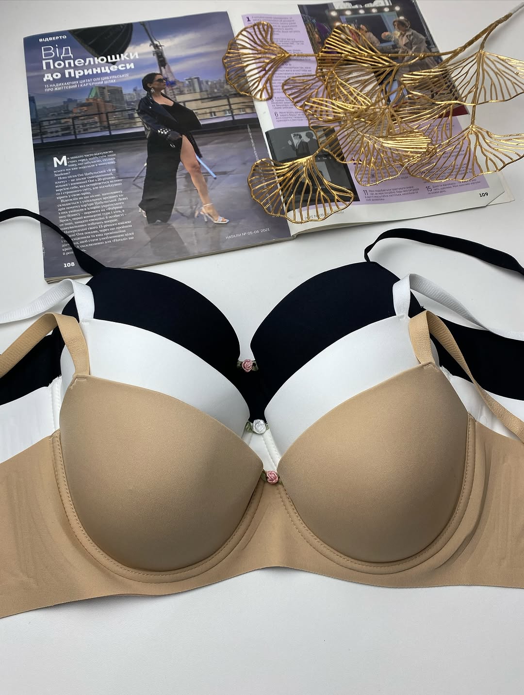 Гладкий бюстгальтер на тонкому поролоні, спинка безшовна, бретелі незйомні.
